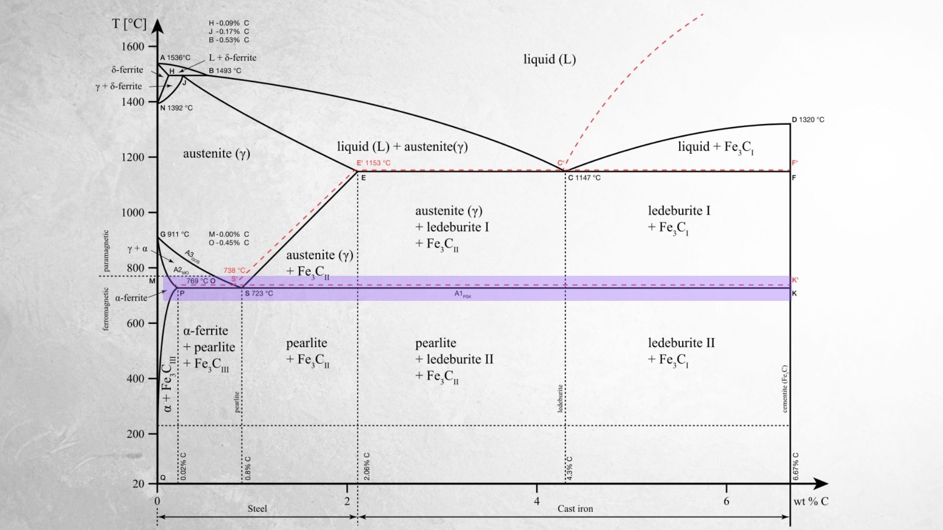 Let us take a basic steel grade from the iron-carbon phase diagram - AISI 1045. To keep things simple, we'll ignore other alloying elements for now. This type of steel is primarily ferritic — meaning its crystal structure is body-centered cubic, or BCC. A Ferritic steel is relatively soft and ductile. Now, if we want to change those properties — for instance, to increase hardness — we need to alter the steel’s structure.