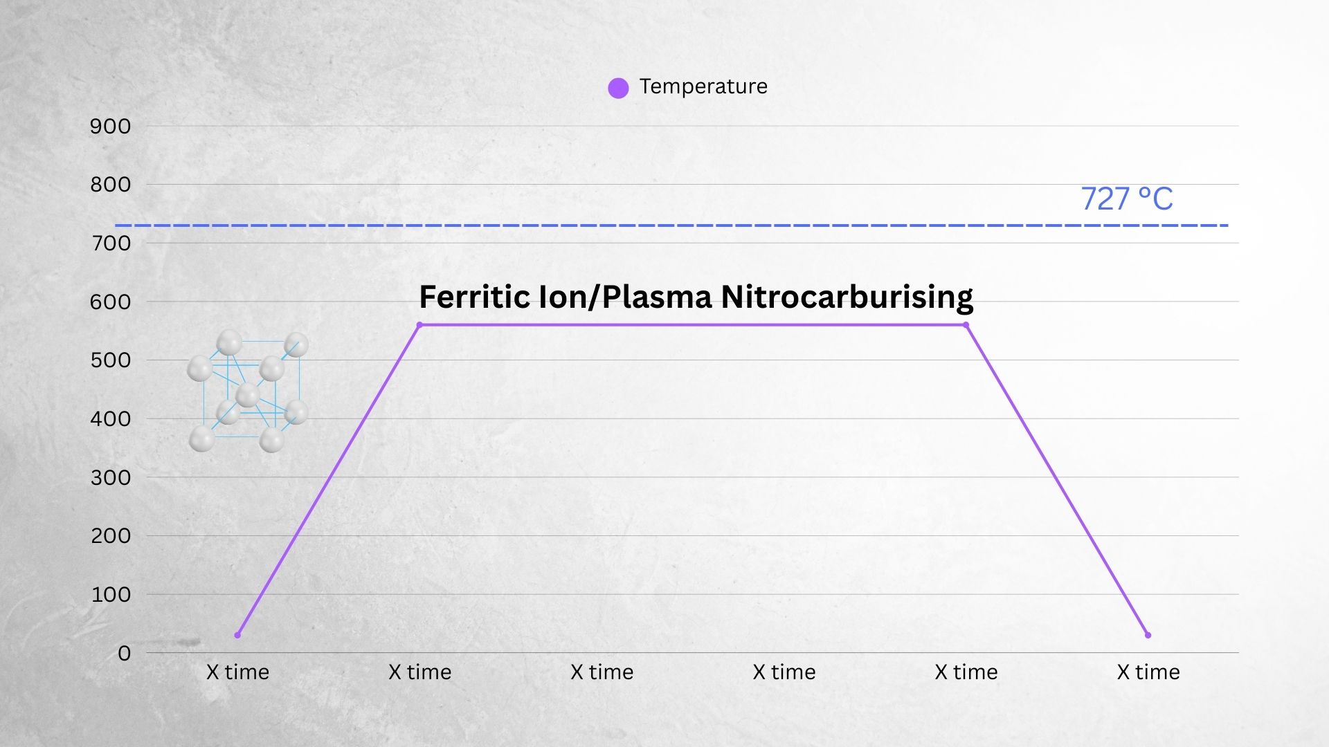 | Phase changes of the steel above 727 C | Ferritic Ion/Plasma Nitrocarburising temperature |